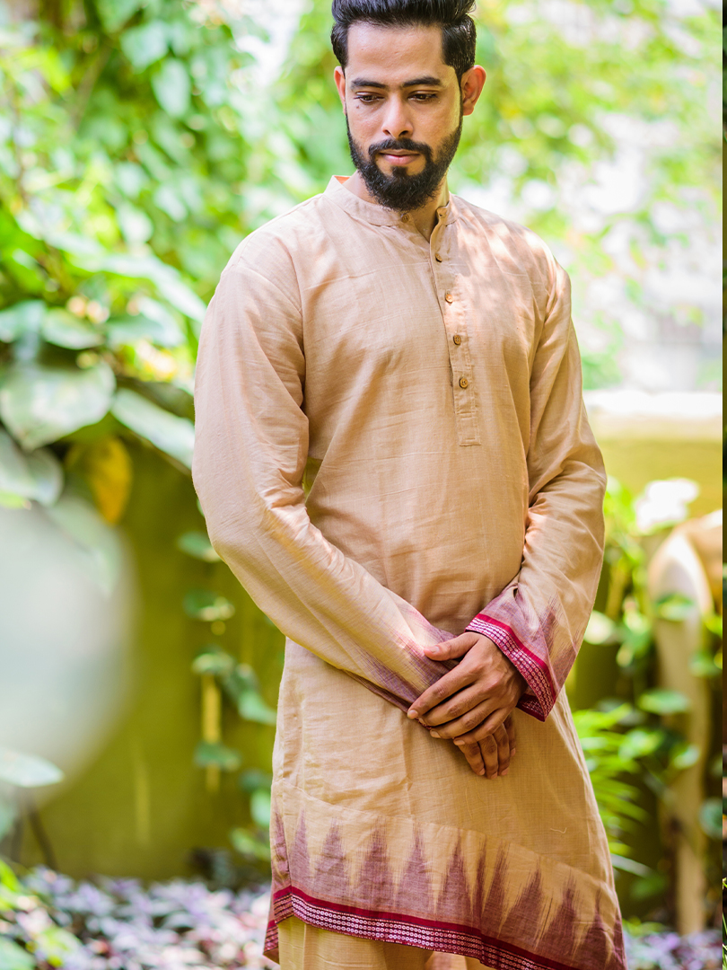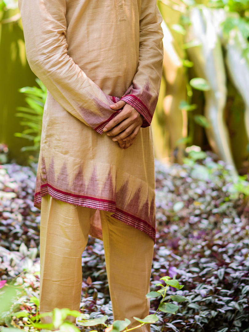 Handloom Kotpad kurta in a subtle beige tone, adorned with maroon woven borders and intricate detailing on cuffs and hemline. A graceful fusion of simplicity and traditional craftsmanship.