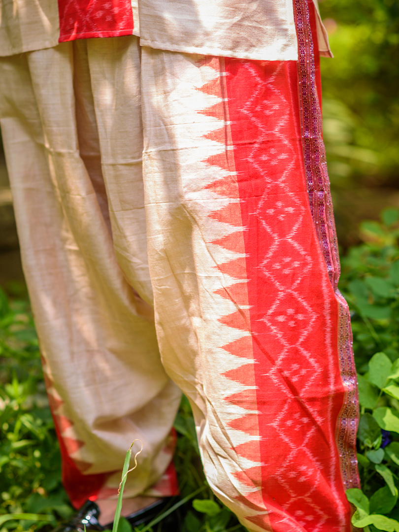 Handloom Kotpad in cream base with striking red woven panels and motifs. Featuring intricate Ikat-style patterns on the neckline, cuffs, and body, this ensemble blends traditional tribal craftsmanship with contemporary elegance.